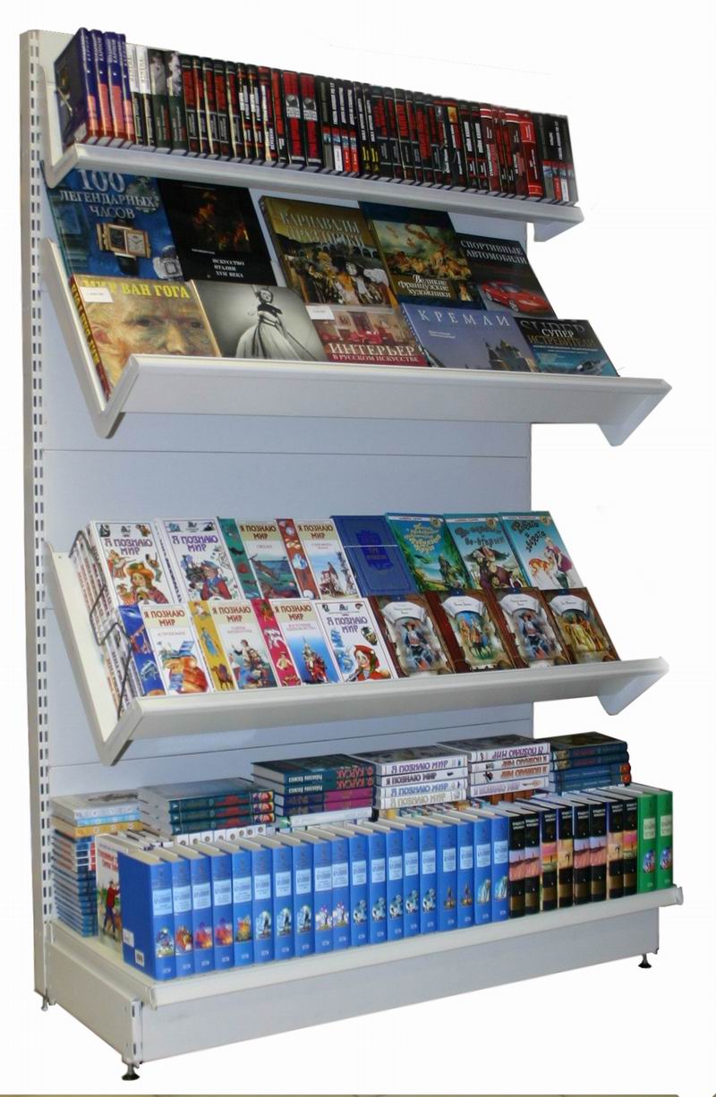 Например, наклонные полки с разделителями на кронштейнах с регулируемым углом наклона позволят разместить значительный объем товара. При этом в регулируемые ячейки продукция устанавливается таким образом, чтобы верхняя часть издания виднелась из-за предыдущего.