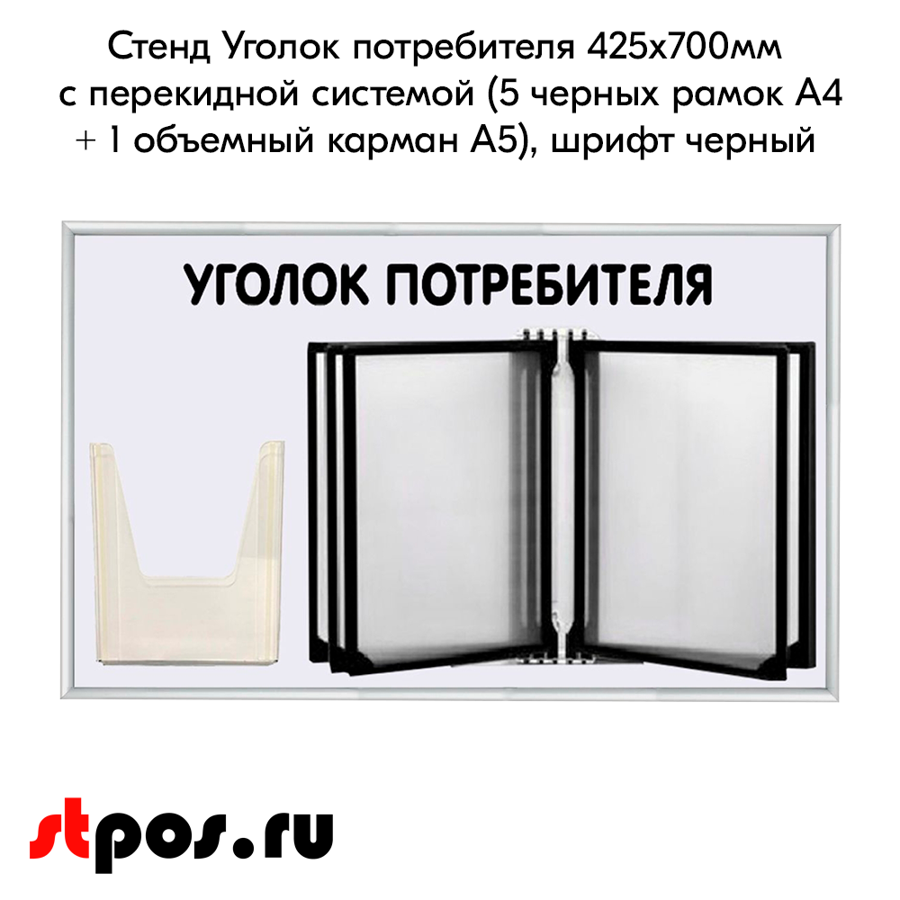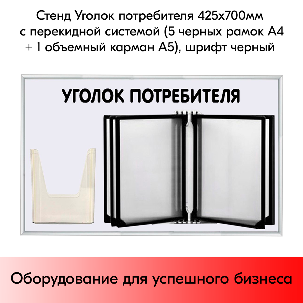 Стенд Уголок потребителя 425х700мм с перекидной системой (5 черных рамок А4+1 объемный карман А5) шрифт черный