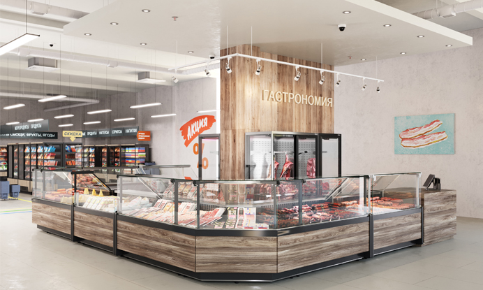 Для витрины используется специальная подсветка красного цвета: она делает мясо более аппетитным.