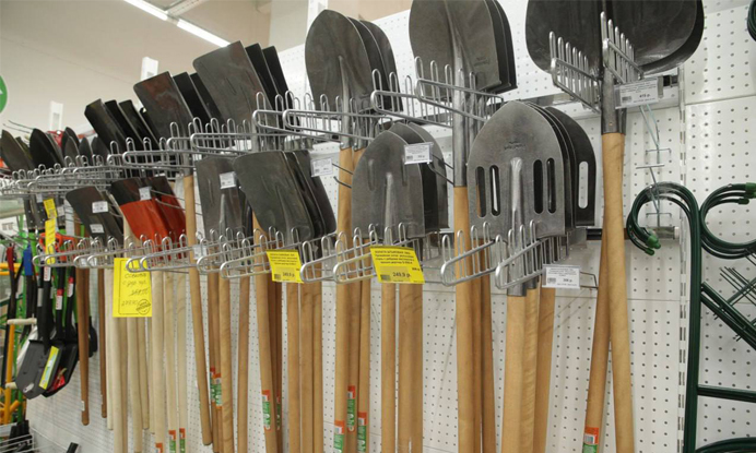 С точки зрения выкладки лопата сложная вещь. Она громоздкая, не может стоять вертикально, выложить горизонтально ее можно разве что вдоль стены из-за длинного черенка. Специализированный крючок позволяет презентовать такой товар легко и сравнительно компактно. И безопасно, потому что уронить лопату себе на ногу немногим лучше, чем наступить на грабли.