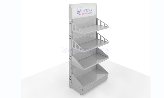 Оснащен специальной базой, двумя видами полкодержателей, декоративной панелью, которые при этом еще и служат ограждением, предотвращая падение и порчу товара (при мобильных акциях очень даже актуально).