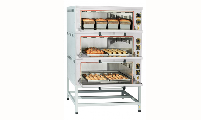 Пекарский электрический подовый шкаф ЭШП-3-01 состоит из 3-х пекарных камер (нержавеющая сталь) вместимостью на 24 хлебные формы (№7). Есть внутренняя подсветка, 2 термостата для каждой камеры.
