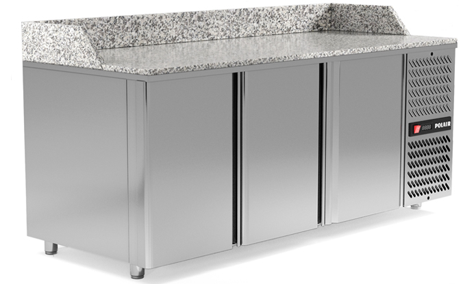Для общепита, который специализируется на пицце, есть вариации с с гранитной столешницей и высокими гранитными бортами с трех сторон. На борта также можно установить витрины для ингредиентов с наклонным размещением гастроемкостей Это даст большее рабочее пространство.