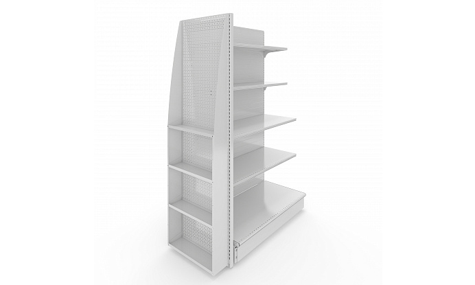 Сочетание полок и перфорации – это уже возможность сочетать и навеску, и горизонтальную выкладку. Рассчитаны такие экспозиторы на нетяжелый товар, с комплектом из семи полок выдерживают 50 килограмм. Экспозитор идеален для кросс-мерчендайзинга, на него эффективно выкладывать товары, сопутствующие наполнению стеллажа (товары для праздника к конфетам, снеки к пиву, одноразовую посуду к напиткам и т.д.). Но и без перекрестной выкладки такое оборудование очень эффективно для компактной презентации легких товарных позиций. Это очень востребовано в магазинах у дома, минимаркетах, магазинах на автозаправках. Впрочем, сукпермаркеты, мегамеркеты и моллы также массово применяют торцевые конструкции. Они в любом случае экономят место, плюс зрительно закрывают боковые части стеллажа.
