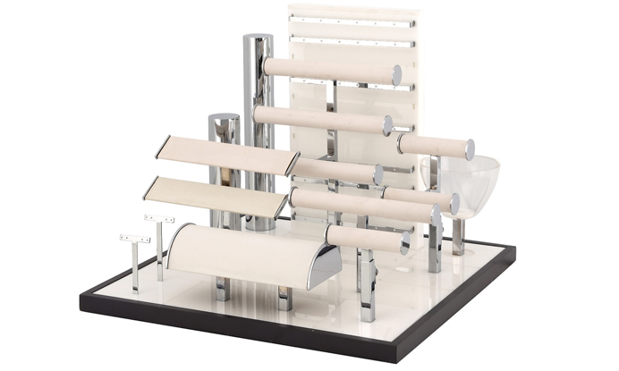 Дисплей для ювелирных изделий. Сюда можно выложить практически все разновидности украшений одновременно: браслеты, ожерелья, броши и пр. Предусмотрена также чаша для выкладки сопутствующих товаров (например, чистящих средств для драгметаллов) или мелкой подарочной упаковки.