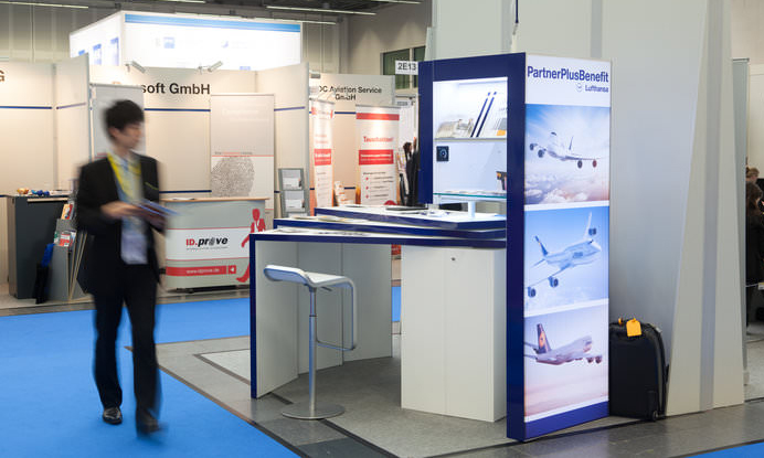 Пример практического использования такого объекта - стойка бонусной программы компании Lufthansa, оформленная в корпоративных цветах.