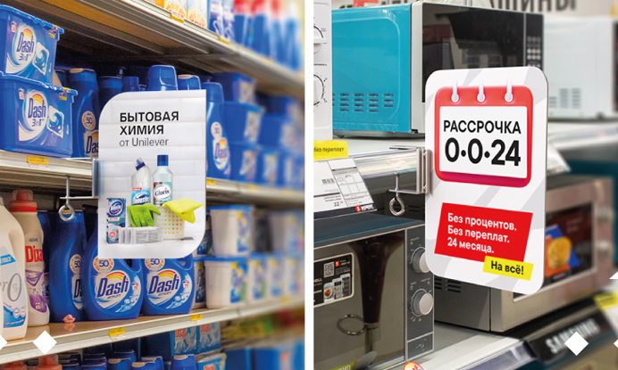 Обе модели – оптимальный вариант для рекламы на месте продаж, выделения части выкладки, навигационных сообщений (например, на длинных рядах стеллажей можно таким образом обозначить типы товара – «Гели для душа», «Шампуни», «Жидкое мыло» и т.д.).