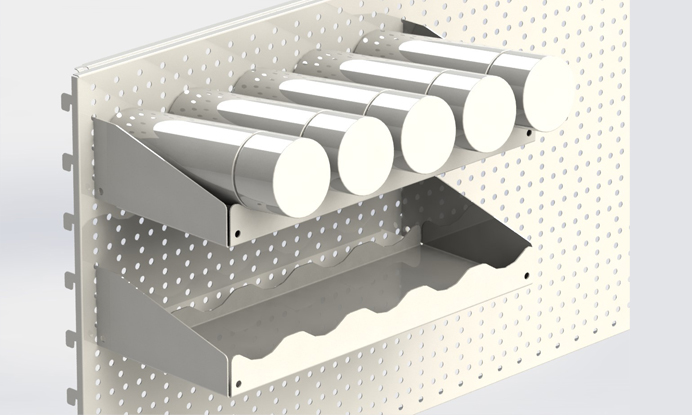 А конструкция «Нордики», позволяет выложить все аккуратно и компактно. Полка – небольшой навесной элемент весом всего в 700 грамм и размерами 150x350 мм. Расположив такие полочки в ряд, реально уместить большое количество баллончиков, располагая их под небольшим углом.