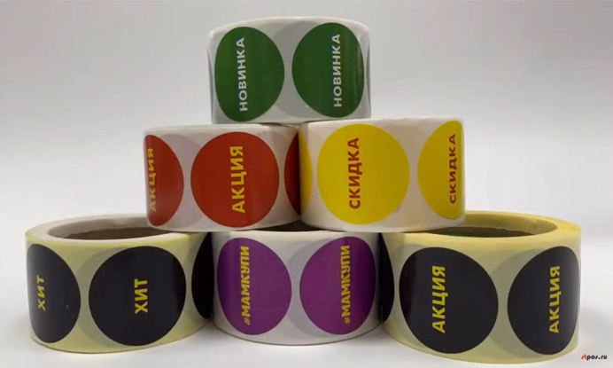 Итак, на выбор «Акция», «Скидка», «Хит», «Новинка» и «Мамкупи». Яркие самоклеящиеся стикеры с надписями крепятся при помощи съемного клея, не оставляя следов. За счет небольшого размера (29 мм в диаметре) они не отвлекают внимания от самого товара, зато за счет своей необычности и яркости очень его привлекают!