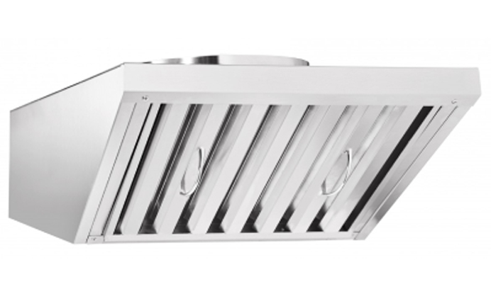 Встраиваемый зонт оборудован лабиринтным фильтром производительностью 1400 кубических метра в час.