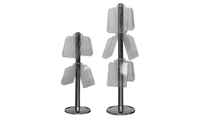 Примечателен стенд для печатной продукции своей монументальностью. Стойка сделана из хромированного металла, на устойчивом круглом основании.
