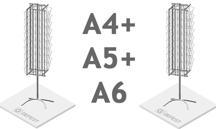 Но А4 это ведь не единственный популярный формат. А5 и А6 тоже часто встречаются. Как правило, это открытки. Для выкладки таких товаров создано множество «гибридных» моделей буклетниц, которые объединяют все три формата: А4, А5, А6.