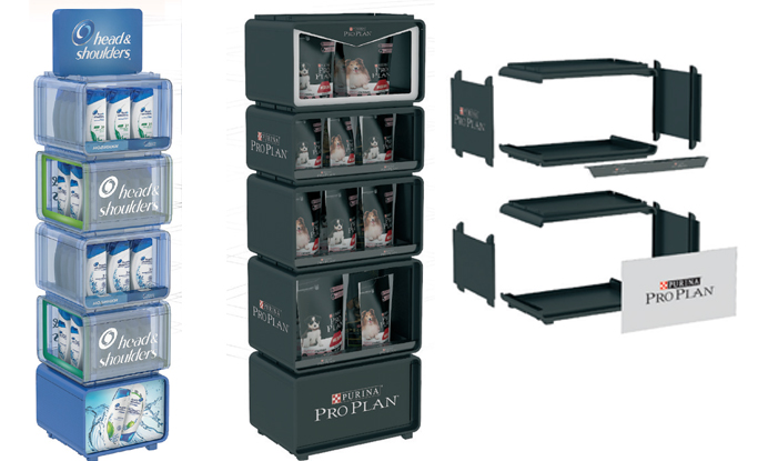 Showbox представляет собой сборную конструкцию (к слову, собирается она без инструмента), напоминающую поставленные друг на друга пластиковые ящички. Эти ящички могут располагаться под прямым углом друг к другу. Доступ к товару – с двух сторон.