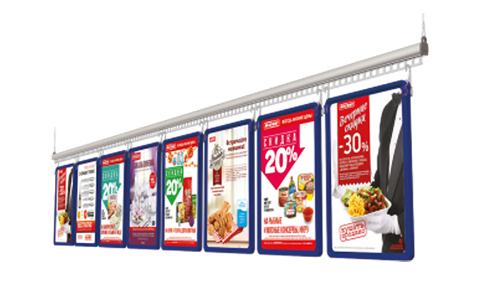 Эта несложная конструкция крепится к потолку на тросах. Алюминиевый облегченный профиль весит немного, поэтому крепить систему можно без опаски. Подходит подвесная система ECOTRACK для торговых залов большой площади. Размещенную на ней информацию покупатель видит из разных точек помещения и реально издалека. В супермаркетах, гипермаркетах, моллах, дискаунтерах подвесные системы наиболее часто размещаются над:
