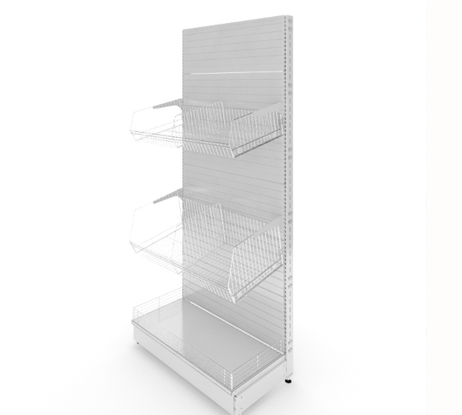 На стеллаже корзинки находятся под небольшим углом, это позволяет покупателю видеть весь ассортимент по высоте стеллажа. Актуален такой стеллаж практически в любом магазине – аксессуары, канцелярия, инструменты, игрушки, продукты в фасовке, мелкая техника… да практически что угодно можно выложить в корзины. Подойдет для кросс-мерчендайзинга.
