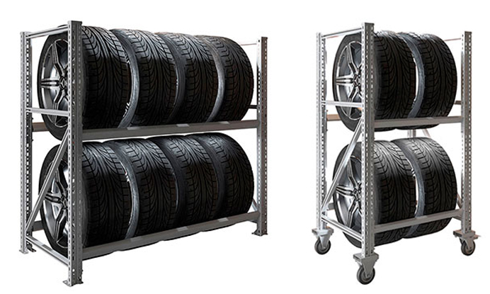 Стационарная модель выдерживает нагрузку в 340 к (170 на ярус), передвижная – 170 кг (85 на ярус). Обе они предназначены для хранения шин от R14 до R20.