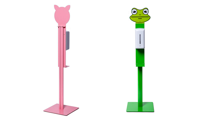 Этой проблемой и озаботились Showdown Displays. Они создали стойки с бесконтактными диспенсерами высотой 1115, 1181, 1184 мм. Мало того, чтобы стимулировать детей не пренебрегать вопросами гигиены, оборудование имеет специальный дизайн: яркие цвета и верхнюю часть в виде мультяшных голов разных зверушек. Конечно, для ребенка таким образом простая обработка рук превращается в элемент игры!