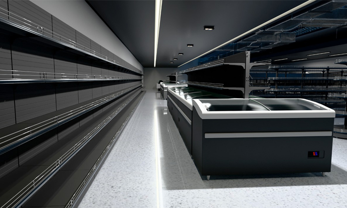 Проекты таких крупных магазинов интересны тем, что необходимо предусмотреть и максимально эффективно расставить большое количество оборудования. Супермаркет на то и супер, что в нем очень широкий и разнообразный ассортимент. Соответственно, необходимы решения разных типов под разные виды товара: овощные стеллажи, хлебные лотки, холодильные бонеты, прикассовые стойки и так далее.