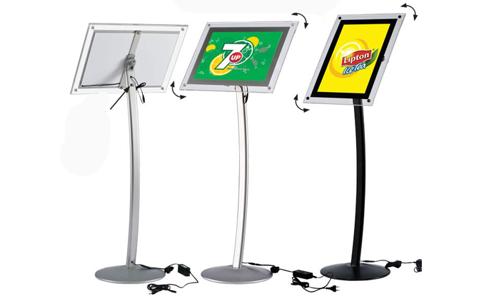 Дисплей подсвечивается LED-светильниками и для этого оснащен кабелем подключения к сети и выключателем. Акриловые пластины скрепляются при помощи резьбового соединения, то есть при необходимости плакат внутри можно поменять за минуту.