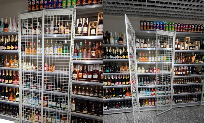 То, что вы видите на фото – сетчатые торцевые панели. Они имеют подвижное крепление, которое фактически превращает их в дверцы. Это сравнительно легкая конструкция, которая не перегрузит стеллаж (а бутылки с напитками и сами по себе не легкие), позволит видеть товарные позиции. При этом свои оградительные функции решение выполняет на ура – панели прочные.