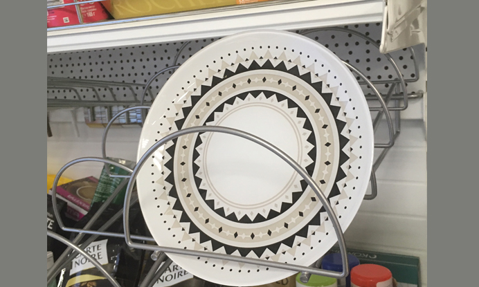 4 секции – это 4 единицы. Разместить на таком крючке можно хоть глубокую тарелку, хоть десертную. Глубина секции такова, что посудина надежно удерживается «в рамках» и не рискует разбиться об пол. При этом товар прекрасно виден покупателю, его легко достать и осмотреть. Это куда безопаснее, чем стопки тарелок на полках, которые нужно перебирать по одной, да еще и аккуратно ставить назад.