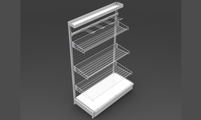 Новый стеллаж создан на базе стандартного «коллеги» 25-й серии. От него прикассовая модель отличается, прежде всего, наличием проволочных деталей: сетчатой стенки, корзин. Прилагается штанга для крючков. Верхняя часть конструкции рассчитана на размещение дополнительной специальной полки.