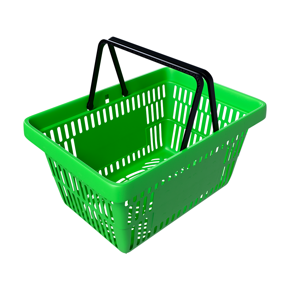 Двадцатилитровая покупательская корзинка – самая распространенная модель в разных типах магазинов. Они достаточно компактны, удобно штабелируются в накопителях, легкие. С ними легко управляться покупателям. Имеют две ручки.