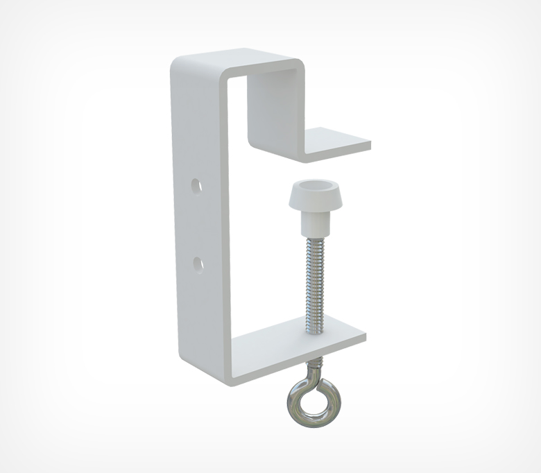 Держатель вывески на струбцине с двумя отверстиями и отгибом позволяет крепить конструкции к полкам толщиной до 40 мм, оснащенными ценниками или бортиками.