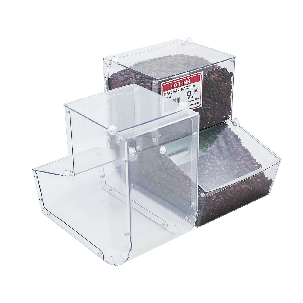 Для продажи сыпучих продуктов питания: конфеты драже, крупы, макаронные изделия, орехи, сухие завтраки, семечки, бобовые, корма для животных.
