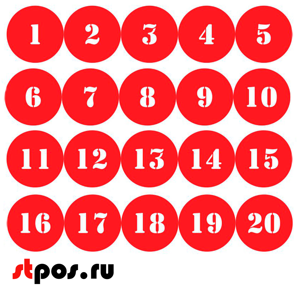 Наклейка для нумерации сумочных шкафов (трафарет) номера 1-20, D-70 мм, красная