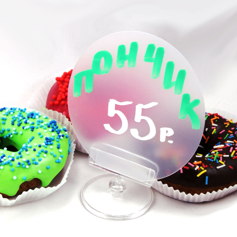 Круглая табличка из плотного пластика прозрачного цвета для нанесения надписей белым или цветным маркером на меловой основе.Толщина табличек - 0,5 мм. Диаметр таблички 100мм.