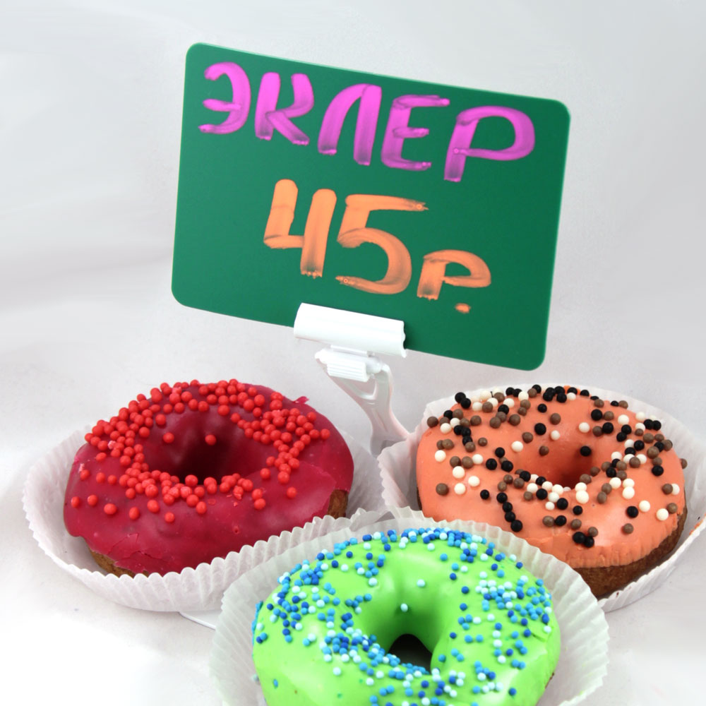 Вставка в рамки или самостоятельный ценникодержатель из плотного цветного пластика для нанесения надписей белым или цветным маркером на меловой основе.Толщина табличек-0,5мм.Углы таблички закруглены.