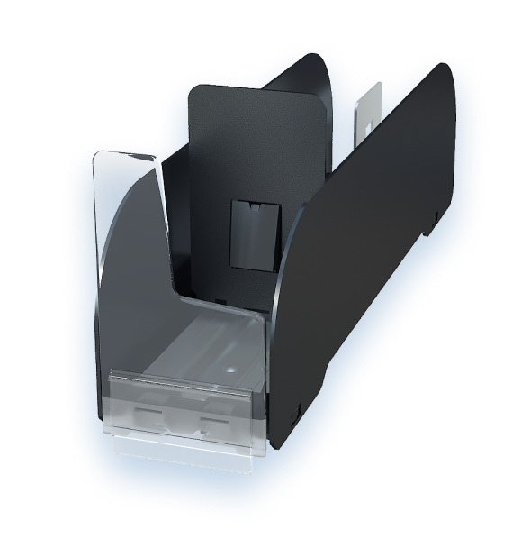 - Съемный ограничитель высотой 140 мм обеспечивает совместимость с распространёнными стандартными упаковками.