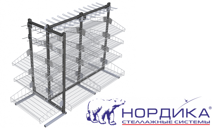 «Нордика» предлагает готовое решение такой задачи - прикассовый островной стеллаж 700 мм с торцевой секцией.