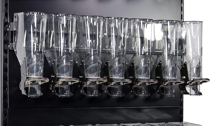 Крепятся такие контейнеры на штанги стеллажа. То есть их можно совместить с выкладкой другого товара и применять в области кросс-мерчендайзинга (классическое сочетание пиво+соленые орехи, к примеру).
