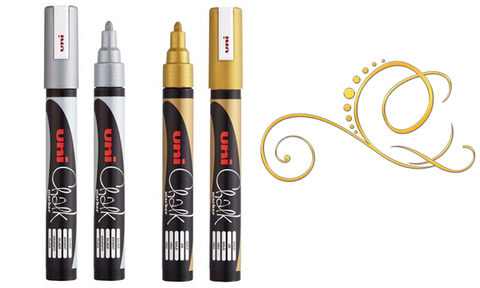 Как и все меловые маркеры, золотые и серебряные Uni Chalk смываются водой, многоразового использования.