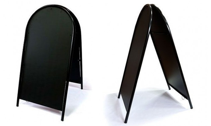 При этом зачастую печально видеть, как люди пытаются на таких конструкциях сэкономить. Неприглядные варианты, явно сделанные кустарным способом, крашеная доска вместо меловой таблички… Возможно, когда штендер предназначен для улицы, владельцы магазинов думают, что он все равно стоит под дождем/снегом/солнцем, его могут поломать и так далее. Нет смысла.