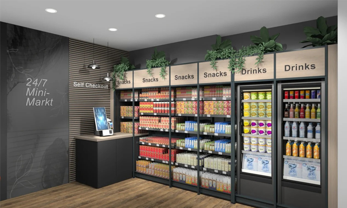 Речь идет о системе модулей для магазина самообслуживания, которая спланирована таким образом, что даже минимальная комплектация уже обеспечивает необходимые потребности покупателей. Хотя система может насчитывать до ста единиц – стеллажи, столы, кофе-модули.