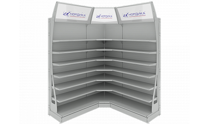 Стеллаж оснащается боковинами с вырезами, которые придают оборудованию приятный и нестандартный вид. Кроме того, этот стеллаж внутреннего угла комплектуется еще и рекламным фризом, созданным специально под эту позицию. Фриз выпуклый, с наклонов в 20 градусов – это значит, что любая информация на нем будет читаться идеально. А кронштейны фриза, органично совпадающие с боковыми элементами, завершают гармоничность облика.